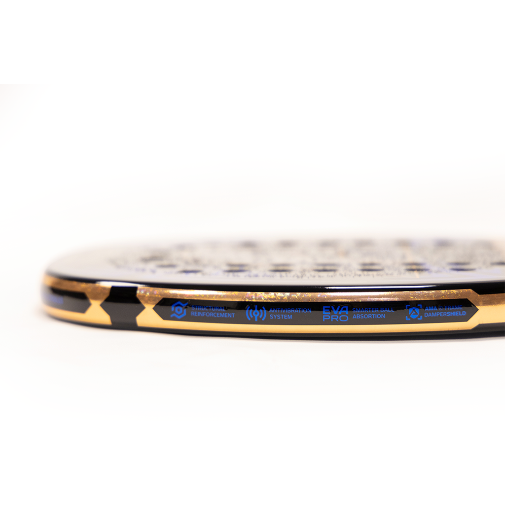 A Proteo apresenta uma combinação sofisticada de azul e preto com detalhes dourados que transmitem personalidade e elegância. Mais do que uma raquete, é um símbolo de estilo para quem busca se destacar dentro das quadras.